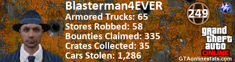 <a href="http://GTAonlinestats.com/showplayer/Blasterman4EVER"><img src="http://GTAonlinestats.com/randomsignature/Blasterman4EVER/sig.png" alt="Blasterman4EVER" border="0" /></a>