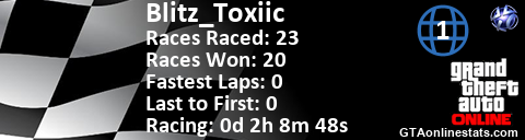 [URL=http://GTAonlinestats.com/showplayer/Blitz_Toxiic][IMG]http://GTAonlinestats.com/racesignature/Blitz_Toxiic/sig.png[/IMG][/URL]