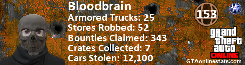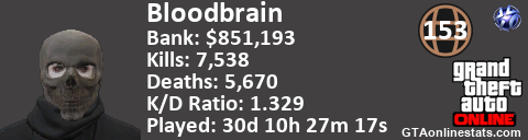 <a href="http://GTAonlinestats.com/showplayer/Bloodbrain"><img src="http://GTAonlinestats.com/randomsignature/Bloodbrain/sig.png" alt="Bloodbrain" border="0" /></a>