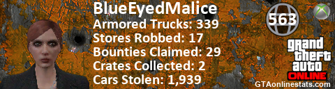 [URL=http://GTAonlinestats.com/showplayer/BlueEyedMalice][IMG]http://GTAonlinestats.com/crimesignature/BlueEyedMalice/sig.png[/IMG][/URL]