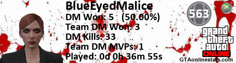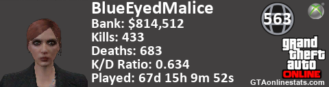 <a href="http://GTAonlinestats.com/showplayer/BlueEyedMalice"><img src="http://GTAonlinestats.com/dmsignature/BlueEyedMalice/sig.png" alt="BlueEyedMalice" border="0" /></a>