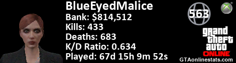 [URL=http://GTAonlinestats.com/showplayer/BlueEyedMalice][IMG]http://GTAonlinestats.com/signature/BlueEyedMalice/sig.png[/IMG][/URL]