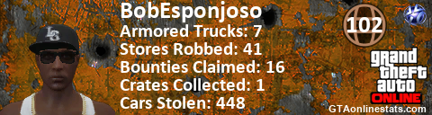 [URL=http://GTAonlinestats.com/showplayer/BobEsponjoso/2][IMG]http://GTAonlinestats.com/randomsignature/BobEsponjoso/2/sig.png[/IMG][/URL]