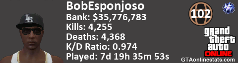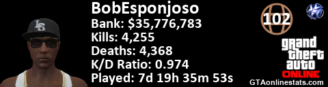 <a href="http://GTAonlinestats.com/showplayer/BobEsponjoso/2"><img src="http://GTAonlinestats.com/signature/BobEsponjoso/2/sig.png" alt="BobEsponjoso" border="0" /></a>