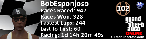 <a href="http://GTAonlinestats.com/showplayer/BobEsponjoso/2"><img src="http://GTAonlinestats.com/racesignature/BobEsponjoso/2/sig.png" alt="BobEsponjoso" border="0" /></a>