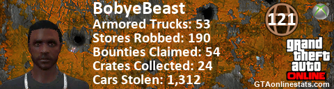 [URL=http://GTAonlinestats.com/showplayer/BobyeBeast][IMG]http://GTAonlinestats.com/randomsignature/BobyeBeast/sig.png[/IMG][/URL]