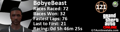 [URL=http://GTAonlinestats.com/showplayer/BobyeBeast][IMG]http://GTAonlinestats.com/racesignature/BobyeBeast/sig.png[/IMG][/URL]