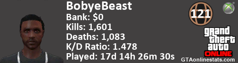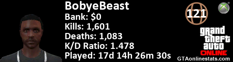 <a href="http://GTAonlinestats.com/showplayer/BobyeBeast"><img src="http://GTAonlinestats.com/signature/BobyeBeast/sig.png" alt="BobyeBeast" border="0" /></a>