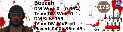<a href="http://GTAonlinestats.com/showplayer/Bozzah/2"><img src="http://GTAonlinestats.com/dmsignature/Bozzah/2/sig.png" alt="Bozzah" border="0" /></a>