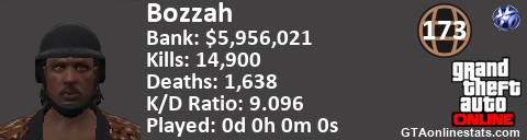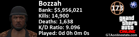[URL=http://GTAonlinestats.com/showplayer/Bozzah/2][IMG]http://GTAonlinestats.com/signature/Bozzah/2/sig.png[/IMG][/URL]