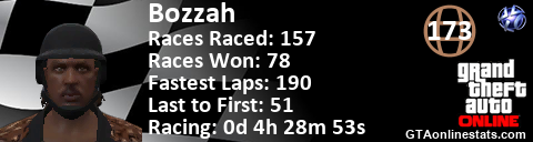 [URL=http://GTAonlinestats.com/showplayer/Bozzah/2][IMG]http://GTAonlinestats.com/racesignature/Bozzah/2/sig.png[/IMG][/URL]