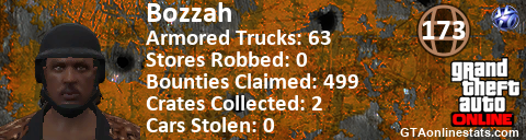 [URL=http://GTAonlinestats.com/showplayer/Bozzah/2][IMG]http://GTAonlinestats.com/randomsignature/Bozzah/2/sig.png[/IMG][/URL]