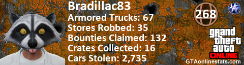 [URL=http://GTAonlinestats.com/showplayer/Bradillac83][IMG]http://GTAonlinestats.com/signature/Bradillac83/sig.png[/IMG][/URL]