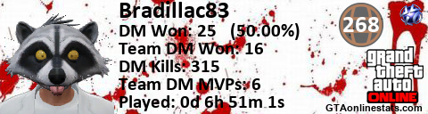 [URL=http://GTAonlinestats.com/showplayer/Bradillac83][IMG]http://GTAonlinestats.com/dmsignature/Bradillac83/sig.png[/IMG][/URL]