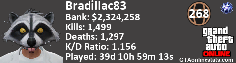 <a href="http://GTAonlinestats.com/showplayer/Bradillac83"><img src="http://GTAonlinestats.com/randomsignature/Bradillac83/sig.png" alt="Bradillac83" border="0" /></a>