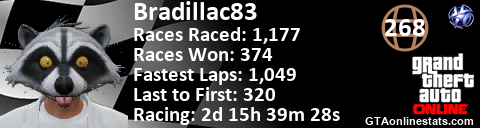 <a href="http://GTAonlinestats.com/showplayer/Bradillac83"><img src="http://GTAonlinestats.com/racesignature/Bradillac83/sig.png" alt="Bradillac83" border="0" /></a>