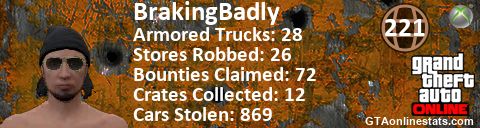 [URL=http://GTAonlinestats.com/showplayer/BrakingBadly][IMG]http://GTAonlinestats.com/signature/BrakingBadly/sig.png[/IMG][/URL]
