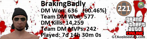 [URL=http://GTAonlinestats.com/showplayer/BrakingBadly][IMG]http://GTAonlinestats.com/dmsignature/BrakingBadly/sig.png[/IMG][/URL]