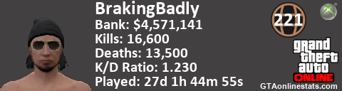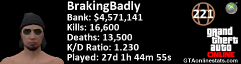 <a href="http://GTAonlinestats.com/showplayer/BrakingBadly"><img src="http://GTAonlinestats.com/signature/BrakingBadly/sig.png" alt="BrakingBadly" border="0" /></a>
