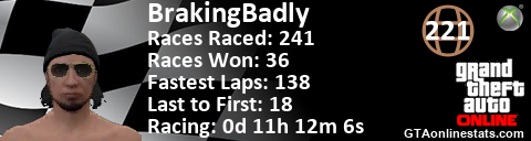 [URL=http://GTAonlinestats.com/showplayer/BrakingBadly][IMG]http://GTAonlinestats.com/racesignature/BrakingBadly/sig.png[/IMG][/URL]