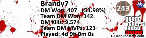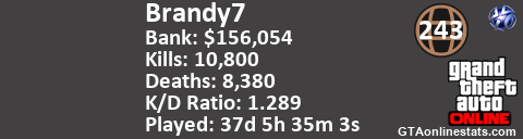[URL=http://GTAonlinestats.com/showplayer/Brandy7][IMG]http://GTAonlinestats.com/signature/Brandy7/sig.png[/IMG][/URL]