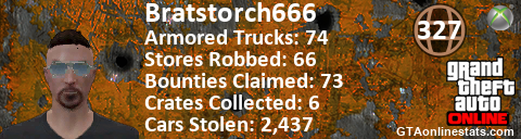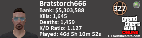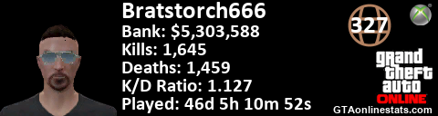 [URL=http://GTAonlinestats.com/showplayer/Bratstorch666][IMG]http://GTAonlinestats.com/signature/Bratstorch666/sig.png[/IMG][/URL]