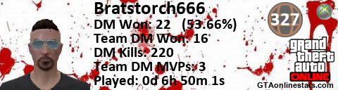 [URL=http://GTAonlinestats.com/showplayer/Bratstorch666][IMG]http://GTAonlinestats.com/dmsignature/Bratstorch666/sig.png[/IMG][/URL]
