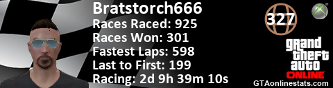 <a href="http://GTAonlinestats.com/showplayer/Bratstorch666"><img src="http://GTAonlinestats.com/racesignature/Bratstorch666/sig.png" alt="Bratstorch666" border="0" /></a>