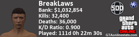 <a href="http://GTAonlinestats.com/showplayer/BreakLaws"><img src="http://GTAonlinestats.com/signature/BreakLaws/sig.png" alt="BreakLaws" border="0" /></a>