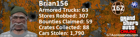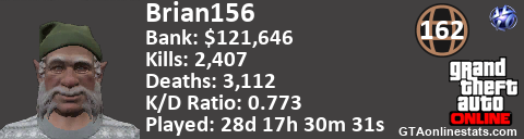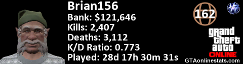 <a href="http://GTAonlinestats.com/showplayer/Brian156"><img src="http://GTAonlinestats.com/signature/Brian156/sig.png" alt="Brian156" border="0" /></a>