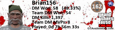 [URL=http://GTAonlinestats.com/showplayer/Brian156][IMG]http://GTAonlinestats.com/dmsignature/Brian156/sig.png[/IMG][/URL]
