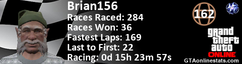 <a href="http://GTAonlinestats.com/showplayer/Brian156"><img src="http://GTAonlinestats.com/racesignature/Brian156/sig.png" alt="Brian156" border="0" /></a>