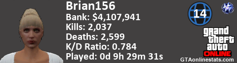 [URL=http://GTAonlinestats.com/showplayer/Brian156/2][IMG]http://GTAonlinestats.com/signature/Brian156/2/sig.png[/IMG][/URL]