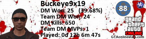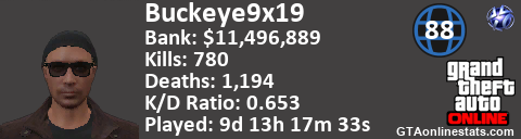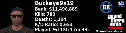 [URL=http://GTAonlinestats.com/showplayer/Buckeye9x19][IMG]http://GTAonlinestats.com/signature/Buckeye9x19/sig.png[/IMG][/URL]