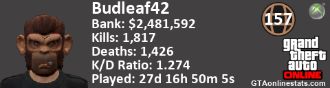 [URL=http://GTAonlinestats.com/showplayer/Budleaf42][IMG]http://GTAonlinestats.com/signature/Budleaf42/sig.png[/IMG][/URL]