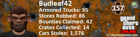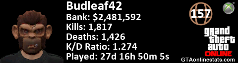 [URL=http://GTAonlinestats.com/showplayer/Budleaf42][IMG]http://GTAonlinestats.com/randomsignature/Budleaf42/sig.png[/IMG][/URL]