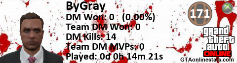 [URL=http://GTAonlinestats.com/showplayer/ByGray][IMG]http://GTAonlinestats.com/dmsignature/ByGray/sig.png[/IMG][/URL]