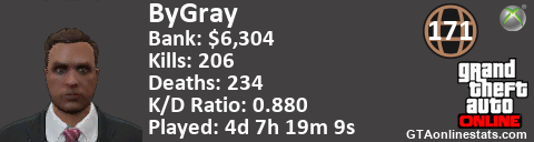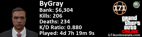 [URL=http://GTAonlinestats.com/showplayer/ByGray][IMG]http://GTAonlinestats.com/signature/ByGray/sig.png[/IMG][/URL]
