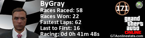 [URL=http://GTAonlinestats.com/showplayer/ByGray][IMG]http://GTAonlinestats.com/racesignature/ByGray/sig.png[/IMG][/URL]