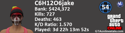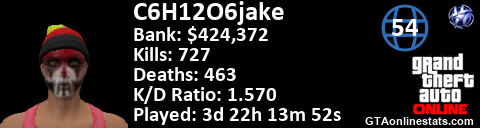 <a href="http://GTAonlinestats.com/showplayer/C6H12O6jake"><img src="http://GTAonlinestats.com/dmsignature/C6H12O6jake/sig.png" alt="C6H12O6jake" border="0" /></a>
