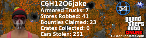 [URL=http://GTAonlinestats.com/showplayer/C6H12O6jake][IMG]http://GTAonlinestats.com/crimesignature/C6H12O6jake/sig.png[/IMG][/URL]