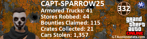 [URL=http://GTAonlinestats.com/showplayer/CAPT-SPARROW25][IMG]http://GTAonlinestats.com/randomsignature/CAPT-SPARROW25/sig.png[/IMG][/URL]