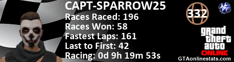 [URL=http://GTAonlinestats.com/showplayer/CAPT-SPARROW25][IMG]http://GTAonlinestats.com/racesignature/CAPT-SPARROW25/sig.png[/IMG][/URL]