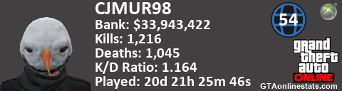 [URL=http://GTAonlinestats.com/showplayer/CJMUR98][IMG]http://GTAonlinestats.com/signature/CJMUR98/sig.png[/IMG][/URL]