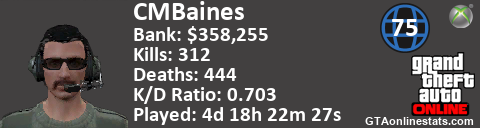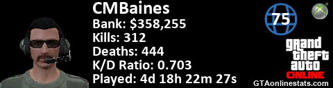 [URL=http://GTAonlinestats.com/showplayer/CMBaines][IMG]http://GTAonlinestats.com/dmsignature/CMBaines/sig.png[/IMG][/URL]