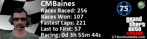 [URL=http://GTAonlinestats.com/showplayer/CMBaines][IMG]http://GTAonlinestats.com/racesignature/CMBaines/sig.png[/IMG][/URL]