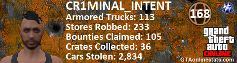 [URL=http://GTAonlinestats.com/showplayer/CR1MINAL_INTENT][IMG]http://GTAonlinestats.com/crimesignature/CR1MINAL_INTENT/sig.png[/IMG][/URL]