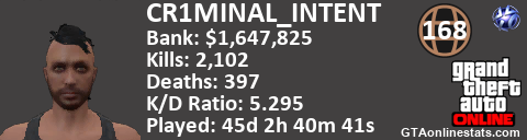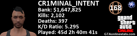 [URL=http://GTAonlinestats.com/showplayer/CR1MINAL_INTENT][IMG]http://GTAonlinestats.com/signature/CR1MINAL_INTENT/sig.png[/IMG][/URL]