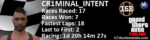 [URL=http://GTAonlinestats.com/showplayer/CR1MINAL_INTENT][IMG]http://GTAonlinestats.com/racesignature/CR1MINAL_INTENT/sig.png[/IMG][/URL]
