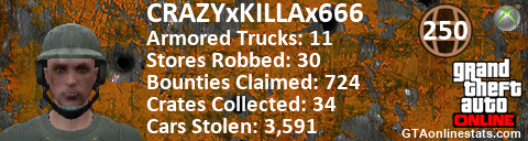 [URL=http://GTAonlinestats.com/showplayer/CRAZYxKILLAx666][IMG]http://GTAonlinestats.com/crimesignature/CRAZYxKILLAx666/sig.png[/IMG][/URL]